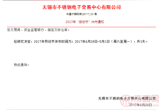 行業(yè)資訊 當(dāng)前位置:首頁(yè)>>信息中心>>行業(yè)資訊 無(wú)錫市不銹鋼電子交易中心發(fā)布2017年“勞動(dòng)節(jié)”休市通知 時(shí)間:2019-06-13 作者:無(wú)錫不銹鋼板 瀏覽:0 2017年4月24日無(wú)錫市不銹鋼電子交易中心官網(wǎng)發(fā)布2017年“勞動(dòng)節(jié)”休市通知,4月29日至5月1日共3天休市。 原文如下: 2017年“勞動(dòng)節(jié)”休市通知 上一篇:無(wú)錫漢能不銹鋼:4月27日無(wú)錫不銹鋼市場(chǎng)參考價(jià) 下一篇:2017年全球鎳需求料增至211萬(wàn)噸
