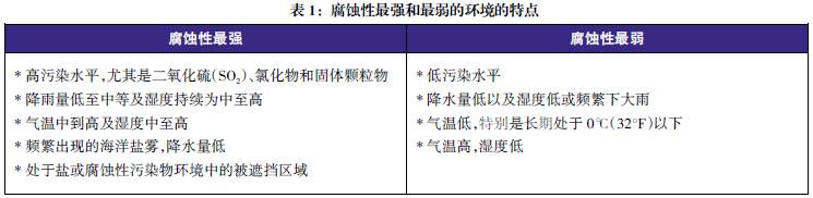 世界各地都進行過各種應用環(huán)境下的金屬腐蝕性能比較試驗。以碳鋼為標準樣品對這些試驗地點的腐蝕性進行了比較。表2給出了標準樣品在北美試驗地點的腐蝕率數(shù)據(jù)。盡管某些地點處于經(jīng)常使用除冰鹽的地區(qū),但樣品并未暴露于除冰鹽之下。
