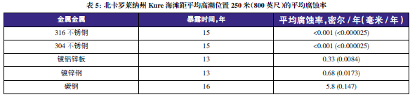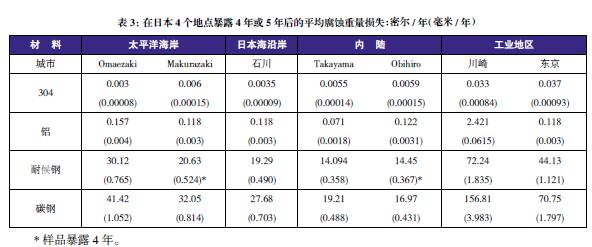 表3至表6的數(shù)據(jù)來自于日本、巴拿馬、Kure 海灘(北卡萊羅納州)和南非的試驗地點。可利用這些數(shù)據(jù)在類似環(huán)境中選擇適當?shù)慕饘俨牧?,進行生命周期成本分析。