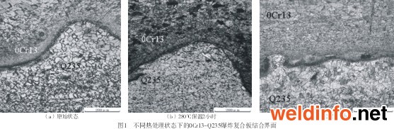 在壓力容器行業(yè)中,特別是一些用于化學工業(yè)的設(shè)備,由于長期在具有腐蝕性的環(huán)境中服役,因此對其制造材料的耐腐蝕性能有很高的要求。如果用單一的耐腐蝕材料進行制造,雖然滿足了使用要求,但是大大提高了生產(chǎn)成本??梢钥紤]在保證材料強度和使用性能的前提下,通過在價格相對便宜的基板上復(fù)合一層耐腐蝕板材來達到降低成本的目的[1]。 本文以0Cr13不銹鋼-Q235碳鋼爆炸不銹鋼復(fù)合板為試驗對象,研究了不同熱處理時長對其結(jié)合界面在組織形態(tài)、元素擴散及顯微硬度等方面的影響,為確定合適的熱處理時間提供了理論指導。