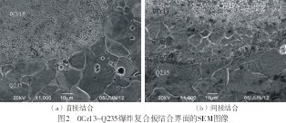 利用掃描電子顯微鏡對爆炸不銹鋼復(fù)合板的結(jié)合界面進行了觀察,發(fā)現(xiàn)不銹鋼與碳鋼之間存在兩種結(jié)合方式,一種是直接結(jié)合(如圖2a所示), 另一種是間接結(jié)合(如圖2b所示)。間接結(jié)合方式中的中間層是由于基板和復(fù)板中的合金元素互溶形成的,該區(qū)域的化學成分介于復(fù)板和基板之間[5]。因為經(jīng)歷了金屬熔化和凝固階段,熔合層易出現(xiàn)氣孔、裂紋等缺陷,成為界面結(jié)合較薄弱的區(qū)域。從圖2中還可以發(fā)現(xiàn),不管是以何種方式結(jié)合,界面附近都有超細晶粒帶出現(xiàn)。這是在爆炸過程中由于材料的高速碰撞,在極短的時間內(nèi)產(chǎn)生巨大的壓力使該處金屬受到很大的剪切作用,塑性剪切功轉(zhuǎn)變的巨大熱量使金屬在很窄的區(qū)域內(nèi)發(fā)生熔化,之后又急劇冷卻,故形成極細的組織,甚至有非晶組織形成[6]。