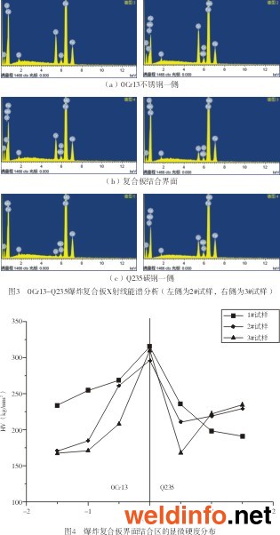 通過掃描電鏡自帶的X射線能譜儀對2#、3# 試樣的基層金屬,結(jié)合界面以及復(fù)層金屬三個區(qū)域進行了分析,結(jié)果如圖3所示,每個區(qū)域各主要元素的含量列于表3、表4之中。由試驗數(shù)據(jù)可得,隨著熱處理時間的增加,界面兩側(cè)元素的相互擴散進行得更加充分,Q235中的Cr含量和0Cr13中的Mn、C含量顯著上升[7]。在不銹鋼一側(cè),長時間的熱處理有助于碳化物的分解,使Cr元素重新固溶到母材之中,消除了貧鉻現(xiàn)象對材料耐腐蝕性能的影響。同時,結(jié)合界面處由于熱處理時間的增加導致碳化鉻數(shù)量的增加, 脆硬的碳化鉻提高了界面處的強度、硬度,但對其塑性、韌性有不利的影響。